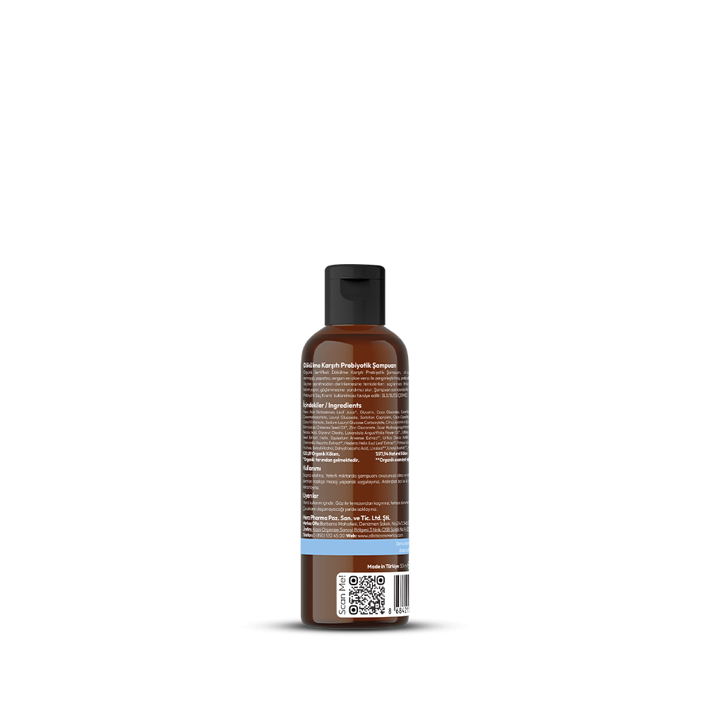 - Organic Certified Anti-Hair Loss Prebiotic Shampoo, enriched with horsetail, caffeine, ivy, chamomile, nettle, and aloe vera, supported with prebiotics.