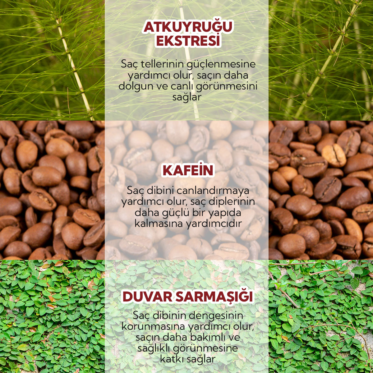 - Organik Sertifikalı Dökülme Karşıtı Prebiyotik Şampuan, atkuyruğu, kafein, duvar sarmaşığı, papatya, ısırgan ve aloe vera ile zenginleştirilmiş, prebiyotiklerle desteklenmiştir.