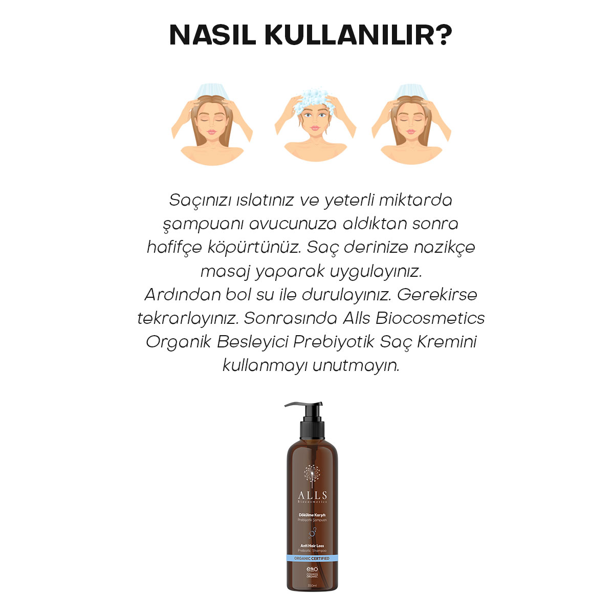 Saçınızı ıslatınız ve yeterli miktarda şampuanı avucunuza aldıktan sonra hafifçe köpürtünüz. Saç derinize nazikçe masaj yaparak uygulayınız. Ardından bol su ile durulayınız. Gerekirse tekrarlayınız.